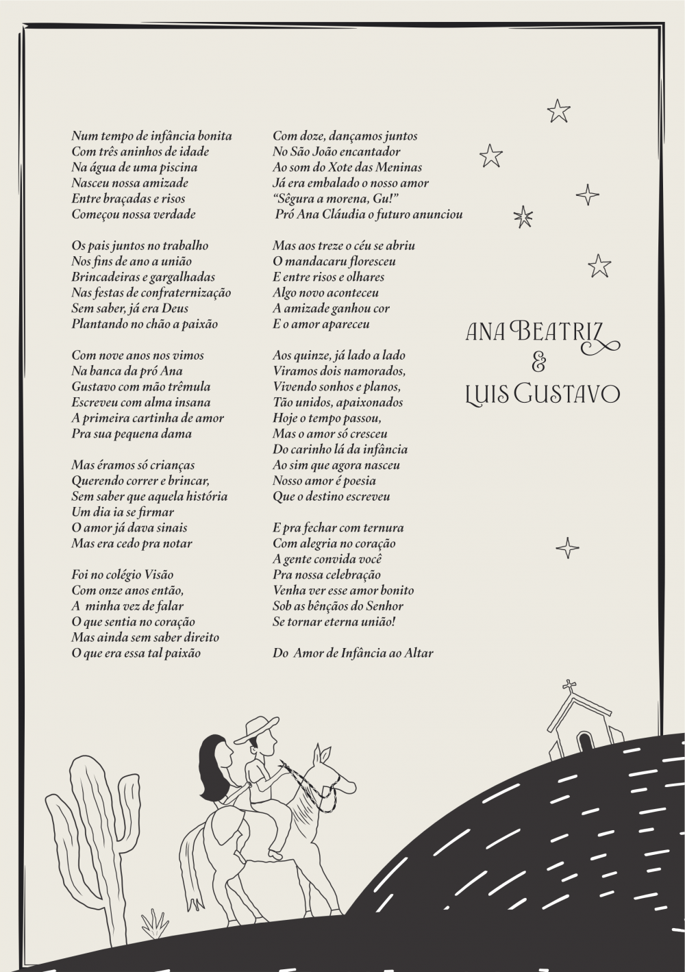 Gostaríamos muito de contar com a presença de todos vocês no momento em que nossa união será abençoada diante de Deus! A cerimônia será breve e tentaremos ser extremamente pontuais. Contamos com vocês! Cerimônia: 08:30 - Paróquia Santa Clara de Assis - R. Amado Bahia - Tomba